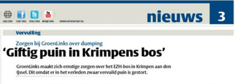 Onlangs publiceerden wij op deze site over een stortplaats van verdacht puin in het EZH-bos. Naar aanleiding daarvan verscheen in Het Kontakt (Editie Krimpenerwaard West) op 6 oktober een artikel. Onderaan dat artikel staat de volgende reactie van de gemeente: