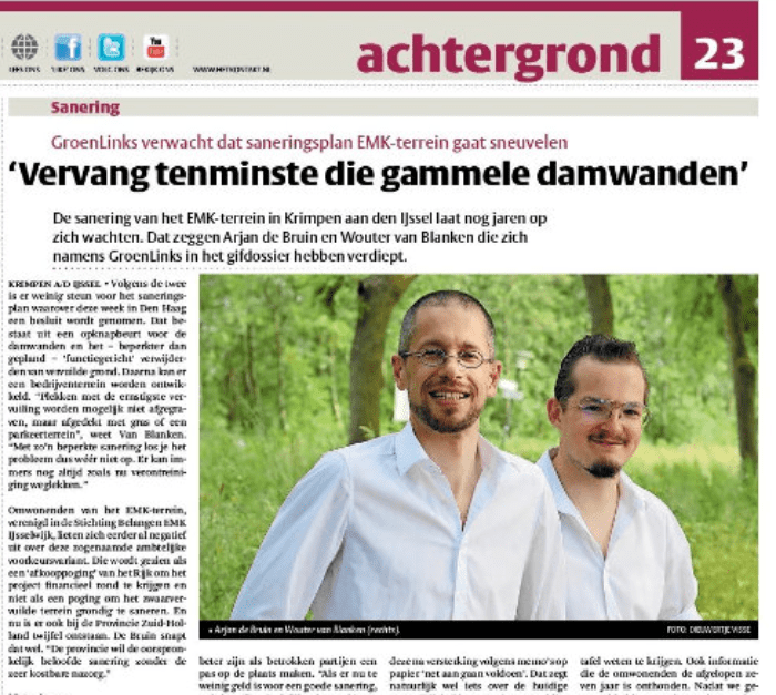 De sanering van het EMK-terrein in Krimpen aan den IJssel laat nog jaren op zich wachten. Dat zeggen Arjan de Bruin en Wouter van Blanken die zich namens GroenLinks in het gifdossier hebben verdiept.